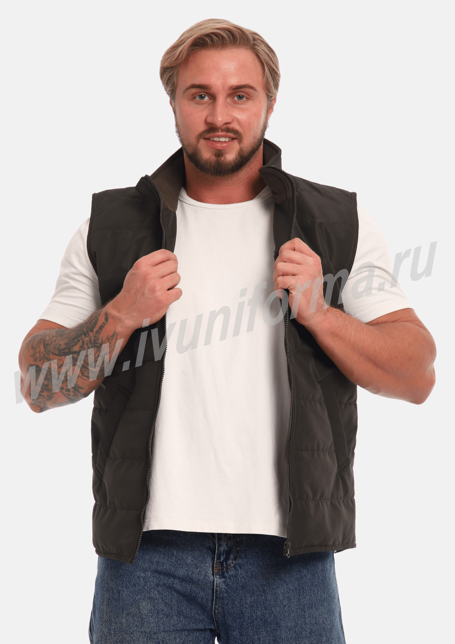 Жилет утепленный на молнии с двумя боковыми карманами в нижней части. Внутренняя часть жилета выполнена из ткани флис. В качестве утеплителя используется синтепон. Жилет является универсальным для использования как мужчинам, так и женщинам.